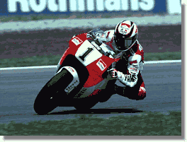 Wayne Rainey. During the last few years of GP500's brilliant age, his superb talent and gentlemanly manners earned him the distinction as a true World Champion. Fast, strong, graceful, yet smart and gentle. His greatness is etched into the hearts of all fans more as fond memories than just records. |