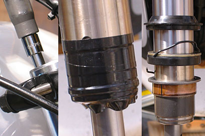 | 終われば、左右それぞれのサブアッセンブリーにフォークオイルを10cc程度ずつ入れる。これは、オイルに浸かった状態でテーパースピンドルの位置を決めるためだ。そして、片方ずつ、アウターチューブをフルボトムさせたところで底部のボルトをいったん緩め、アウターチューブをオイルロックが効く範囲(この範囲 |