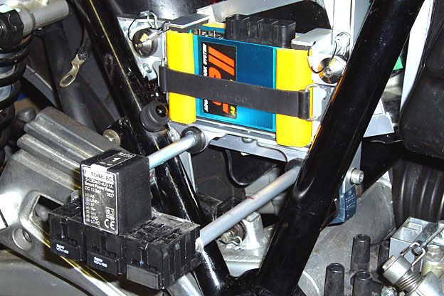 調子に乗って過剰スペック(必要以上の防振構造)のイグナイターユニットマウントを作ってしまったので、肝心のソリッドステートリレー(SSR)の配置が苦しくなった(笑)。イグナイターユニットを留めるゴムバンドの表面〜サイドカバー裏面間の隙間は充分でも、V字型のフレーム間に“で〜ん”とイグナイターユニットが座っているため、ステーを取りつけるスペースがない。 収納スペースはあるから、マウントくらい、あとで何とかなるだろう …と楽観的に構えていたのがマズか った。SSRを支持するミニISOソケットを取りつけられそうな場所は、イグナイターユニットの下を左右に通 っているアングル(10月8日の3点目の写真)の縦の面しかない。 |