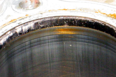 | れ、同じことが起きていない保証はないので、気休め的に、見てもわからない程度にオイルストーンでなぞ っておいたというわけである。 上死点時のトップリング位置よりも上のシリンダー内壁に固着したカ ーボンは、スチールウール(商品名ボンスター)で削り落とした。シリンダー内壁には、リングのストップ位置の痕跡や縦縞が目立つものの、指先でなぞった限りでは傷も段付き摩耗もなく、このまま継続使用しても何ら問題なしと判断した。 |