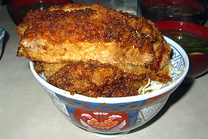 ら奥様の普段の足である軽自動車を借りてきたらしい)の運転のあまりの遅さにイライラしていたのは、ここだけの内緒の話である。 小池さんに連れられた我々が着いたのは、三州街道と伊那街道が交差する伊那市入舟にある“中華飯島” というお店だった。全員、メニューを確かめるまでもなく、名物のソースカツ丼を注文。しばし間をおいて出てきたのは、右の写真のような特大のカツ丼だった。これがいわゆる “並”である。健啖家揃いのメンバ ーにもかかわらず、完食したのがわずか3人だったといえば、あるいはこの私でさえ最後のほうは、咀嚼から嚥下までに居心地の悪い間が必要だった…といえば、常識はずれな大きさがおわかりいただけると思う。 |