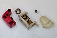 | ソケットを交換したので、念のため、ソケットを取りつけたヘッドライトをライトケースに装着し、底部のクリアランスを確認したところ、まったく問題なし。ソケットの後端面とヘッドライトケース底面の間には、まだ10mmほど隙間がある。これなら余裕で、昨日書いた配線+端子台の保護カバーを設置できそうだ。 今日は、ヘッドライト球用のソケ ットの他にも、いろんなパーツが届いた。オヤイデ電気からはプラグコ |