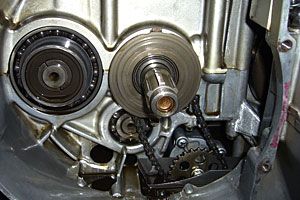 | 帰ってきて、家の用事を済ませながらエンジンが冷えるのを待ち、ず っと手を触れていても大丈夫と思える温度(たぶん摂氏40度程度)にな ったところでクラッチをバラした。 2つの心配のうち、小さいほうはすぐに解消した。昨夜削ったクランクケースには、ヤスリの目がそのま |