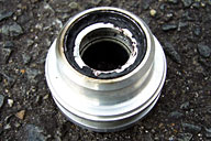 | シールヘッドというのは、一般的な正立型フロントフォークに例えると、アウターチューブ上端付近の外径の太い部分だけをモジュール化したような物だ。この、アルミ削り出しのシールヘッドは、内側に下(外側)から順に、ダストシール、バックアップリング、オイルシール、ソ |