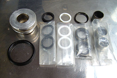 | リッドブッシュが入っている。 10月30日に最初の1本をバラして構造を確かめ“このパーツ構成ならこれとこれと…”てな具合に今回の交換部品を決めて注文した。が、中には“普通のオーバーホールでは、そこまで替えませんよ”と言われたパーツもあった。シールヘッド関係 |